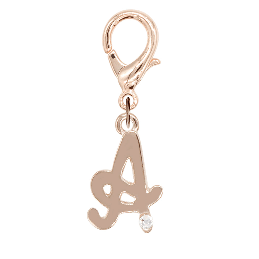 ロゴの端に小さなラインストーンがついたイニシャルチャーム。